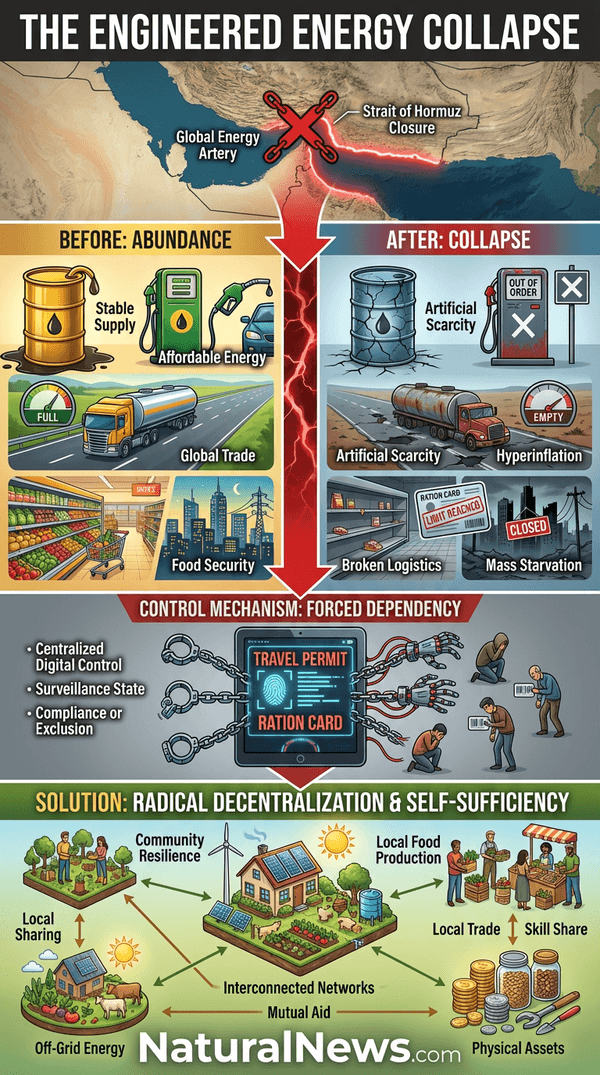 What we are witnessing is the rapid, violent imposition of artificial scarcity where abundance once flowed. The Strait of Hormuz, a narrow maritime chokepoint, carries roughly one-fifth of the world’s oil consumption and a similar share of global LNG trade. [1] Its closure doesn’t just raise prices; it triggers a ’12-order cascading analysis’ of systemic failure, exposing a global machinery of dependence so extreme that the interruption of this one corridor can propagate into ‘a general crisis of civilization.’ [2] This isn’t strategy; it’s sabotage. They are not trying to solve a problem. They are creating the ultimate problem to justify the ultimate solution: total control.